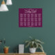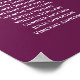Machen Sie Ihren Hochzeitsempfang mit diesem Sitzplan schön. Es zeichnet sich durch ein schlichtes und dennoch elegantes Design aus, mit weißem Text auf einem lila, pflaumenfarbenen Hintergrund mit silberfarbenem Imitat, Pflaume, Beeren oder magentafarbenem Hintergrund. Dieses Diagramm zeigt die Sitzplatzbelegung für 18 Tische, sodass Ihre Gäste den richtigen Tisch leicht finden können.