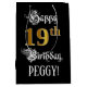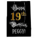Dieses luxuriöse und verzierte Geschenktütendesign beinhaltet die Meldung "Happy 19 th Birthday" und einen benutzerdefinierten Namen. Einige der Nachrichten sind in einem extravaganten Skripttext enthalten, die große Zahl "19." weist ein Imitat/Imitation von goldinspiriert Aussehen auf, und der Hintergrund ist schwarz. Eine elegante Geburtstagsgeschenktasche wie diese könnte eine respektable Art sein, ein Geschenk oder Geschenk zu verpacken, das zur Feier des neunzehnten Geburtstages von jemandem gegeben wird. [~Z0000560]