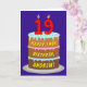 An der Vorderseite dieses lustigen und optimistischen Geburtstagskarten-Designs steht eine Darstellung eines dreistufigen Geburtstagskuchens mit nummerförmigen Kerzen auf der Oberseite, die das Alter "19" zeigt, sowie die Meldung "HAPPY 19TH BIRTHDAY" und ein bearbeitbarer Empfängername. Die Innenseite hat eine bearbeitbare Geburtstagsgrüßnachricht, oder könnte gelöscht und leer verlassen werden, wenn eine Nachricht stattdessen von Hand geschrieben werden soll. Eine fröhliche, personalisierte Geburtstagskarte wie diese wird geschickt, um jemandes neunzehnten Geburtstag zu feiern. [~Z0000620]