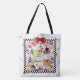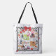 Große, überdruckte Tasche aus gebürstetem Polyester mit einem Bild von hübschen Damen, die in einem Café in Paris sitzen und einen schönen Apriltag genießen, in einem schwarz-weißen Schachbrettrahmen auf einem abgewaschenen Bild von schwarzen Eiffelturmen in Weiß. Sehen Sie sich die gesamte Kollektion des Cancan Tote Bags in den SPEZIELLEN TOUCHS an. | Abschnitt Gastgeschenke.