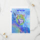 Ein blauer, grüner und roter marmorierter Hintergrund mit einem Geburtstagskuchen und einer Kerze in der Mitte des Einladens und den lustigen, spielerischen Wörtern, die Save the Date in blauen Buchstaben stehen. Der Kartenrücken hat den ersten Geburtstag des Babys mit Datum, Zeit und Ort in denselben blauen Buchstaben. Entsprechendes Porto, Mitteilungskarten und Magnet.