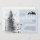 Abenteuer erwartet die rustikale Waldlandschaft die Party Einladung des 1. Geburtstages mit einem kleinen kahligen Bären, in sanften Pastellgrautönen, mit einem majestätischen Waldkiefer und einer Silhouette der Berge.