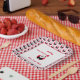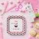 Ein Geburtstagsgeschenk für ein einjähriges Kind. Alle Textelemente können personalisiert sein: Name, Beschriftung, Gruß. Das Design umfasst einen lächelnden Panda mit einem roten Ballon, auf dem die Abbildung 1 steht. Ein weiteres Muster von Pandas auf einem hellrosa Hintergrund schmückt den Rand der Platte.