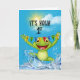 Grüner Frosch mit Geburtstagsbanner, der aus blauem Wasser auf Himmelshintergrund springt, für den 1. Geburtstag eines Kindes.