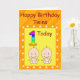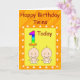 Geburtstagskarte für Ihre speziellen kleinen Zwillinge zum ersten Geburtstag. Auf der Vorderseite ist eine große mehrfarbige Zahl 1. Unterhalb des Hotels befinden sich zwei kleine Zwillingsbabys in einem weißen Windeln und ein großes Lächeln. Dieses niedliche Bild ist in einem orangefarbenen Rahmen mit weißen Sternen unterwegs. Oben sind die Worte "Happy Birthday Twins in dunkler Schrift. Im Inneren sind die Worte, "Wünschen Sie unseren speziellen kleinen Zwillingen einen sehr glücklichen Geburtstag" All ist in einer Vorlage, die Sie löschen oder ändern können Ihren eigenen Text.
