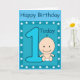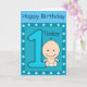 Blaue Geburtstagskarte für Ihre kleinen Jungs zum ersten Geburtstag. Auf der Vorderseite ist eine große Zahl 1 in blau dunkelblau Kontur. Neben dem ist ein kleines Baby in einer weißen Windel und ein großes Lächeln. Über dem Baby steht das Wort Heute. Dieses niedliche Bild ist in einem blauen Rahmen mit weißen Sternen unterwegs. Oben sind die Worte "Happy Birthday in dunkelblauen Buchstaben. Im Inneren sind die Worte, "wünscht unserem kleinen Jungen einen sehr glücklichen Geburtstag" Alles ist in einer Vorlage, die Sie zu Ihrem eigenen Text ändern können.