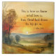 Keramik mit inspirierender Zitat-Schrift zeigt eine wunderschöne goldene Sonnenuntergang Wasserfarbenlandschaft mit Gelb, Blau und Grün. Es zeigt einen geliebten und ermutigenden Bibelvers 1 John 3:16, "So wissen wir, was Liebe ist: Jesus Christus legte sein Leben für uns fest."