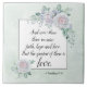 Die Zitat-Keramik-Fliese zeigt eine schöne Anzeige von Rosen in Weiß und Rosa und zeigt Bibel Verse 1 Korinther 13:13, "Und nun bleiben diese drei: Glauben, Hoffnung und Liebe. Aber das bestste davon ist Liebe." _
