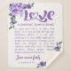 Liebe ist geduldig, Liebe ist gütig. Es beneidet nicht, es prahlt nicht, es ist nicht stolz. Es ist nicht schmählich, es ist nicht selbstsüchtig, es ist nicht leicht verärgert, es behalte keine Aufzeichnung von Fehlern. Liebe erfreut sich nicht des Bösen, sondern freut sich über die Wahrheit. Sie schützt, vertraut immer, hofft, hält immer an. Liebe versage nie. - 1 Korinther 13:4-8 Inspiration Christliche Liebe Zitat Lila Blumendesign. Gutes Geschenk für Familie und Freunde.