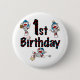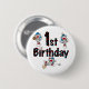 Drei wenige Sockenaffen, die blaue Baseballmützen tragen, werfen und schieben, und up am Schläger auf unserem Socken-Affe-Baseball-1. Geburtstagsentwurf, der Sockenaffen und coolen Text, der, kennzeichnet "1. Geburtstag" liest.