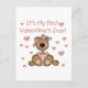 Ein Teddybär, der in einem rosa Kleid und Bogen gekleidet ist, umgeben von Herzen und rosa Text, der auf T - Shirt, Magneten, Karten, Aufklebern, Karosserien und vielem mehr "It's My First Valentine's Day" steht.