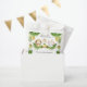 This green and yellow 'wild one' design is suitable for a boy or girl's 1st birthday party. The design includes watercolour jungle leaves, a trio of jungle animals (lion, giraffe and elephant) and party balloons and gifts.
