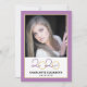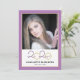 Diese moderne Graduiertenparty lädt mit einem quadratischen Foto auf der Vorderseite und einem vollen senkrechten Foto auf der Rückseite zum Verweilen ein. Das Farbthema ist lila und goldgelb, das geschlossen Jahr 2020 erscheint in einem eleganten Drehbuch.