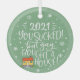 Moderne und trendige Weihnachtsschmuck zum Feiern Ihrer neuen Zuhause mit einer lustigen handgeschriebenen Beschriftung, die lautet "2022 Sie sind zum Kotzen! Aber yay, kaufte ein Haus!" in weißen, handgeschriebenen Schriftart auf einem hellgrünen Hintergrund, und ist mit Schneeflocken und einem kleinen Cartoon-Haus dekoriert.