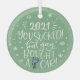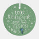 Moderne und trendige Weihnachtsschmuck für neue Fahrer mit einer lustigen handgeschriebenen Beschriftung, die lautet "2022 Sie sind zum Kotzen! Aber yay, kaufte ein Auto!" in weißen Schriftart auf einem hellgrünen Hintergrund, mit Schneeflocken und einem glänzenden, nagelneuen Autoschlüssel geschmückt.