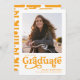 Die minimale und einfache Ankündigung des Abschlusses beginnt mit Ihrem Foto. Graduate und der andere Text ist in einer fett-trendigen Terrakotta orange Typografie geschrieben. Ein gewagtes 70er-Grafikmuster in hellrosa, orange, staubblau und olivgrün schmückt die Rückseite. Dieser Abschluss Ankündigung bietet Klasse von 2023, Ihr Name und Schule.