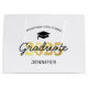 Maßgeschneiderte Abschluss Geschenktasche mit einem Graduiertencap, 2025 in Imitaten Gold, Schulname, Schülername, und das Wort Absolvent in einem Skript-Schriftart.