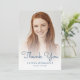 Moderne Dankeschön-Karte mit einem individuellen vertikalen Foto für Abschluss. Die Wörter "Danke" erscheinen in blauer Schriftzeichen-Overlay, mit dem Namen und Jahr des Abschlusses des Absolventen unten in Sans Serif Schriftart. Ersetzen Sie das Beispielbild einfach durch das Foto Ihres eigenen Absolventen. Ein Bildschirm mit weißem Farbverlauf trägt dazu bei, die Pop des Textes zu gewährleisten. Auf der Rückseite befindet sich ein blauer, tropfender Imitat-Glitzer auf einem Hintergrund. Passen Sie den Text mit Ihrer eigenen Dankeschön-Notiz an, oder löschen Sie ihn, um Raum für individuelle handgeschriebene Nachrichten zu schaffen.