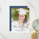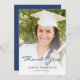 Einfache, moderne Abschluss Dankeschön-Karte mit einem individuellen vertikalen Foto. Die Wörter "Danke" erscheinen in marineblauer lässiger Handschriftenüberlagerung, mit dem Namen und Jahr des Abschlusses des Absolventen unten in serifenlosen Schriftart. Ersetzen Sie das Beispielbild einfach durch das Foto Ihres eigenen Absolventen. Ein Bildschirm mit weißem Farbverlauf trägt dazu bei, die Pop des Textes zu gewährleisten. Passen Sie den Text auf der Rückseite mit Ihrer Dankeschön-Notiz an.