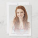 Moderne Ankündigung eines Abschlusses mit einem individuellen vertikalen Foto. Das Wort "Graduate" erscheint in rosa handschriftlich Skript-Overlay, mit dem Namen des Absolventen, Schule und Jahr des Abschlusses unten in Sans Serif Schriftart. Ersetzen Sie das Beispielbild einfach durch das Foto Ihres eigenen Absolventen. Ein Bildschirm mit weißem Farbverlauf trägt dazu bei, die Pop des Textes zu gewährleisten. Fügen Sie Details über die Leistungen Ihres Absolventen und zukünftige Pläne auf der Rückseite, die eine rosa tropfende Imitat Glitzer Rand auf einem ombre Hintergrund.