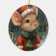 Cute 2025 ornament with a little mouse, all dressed up for the holidays in his Santa outfit and green scarf. The back of the ornament is red and green with a white snowflake.
