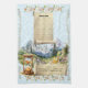 Blue damask kitchen towel/calendar towel. Proverbs 16:9 “In their hearts humans plan their course, but the LORD establishes their steps." Hourglass with Alpine scene, pine trees, daisies, bird and scripture scroll.