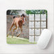 Dieses Bild zeigt einen braunen Eintopf mit einem weißen Strahl auf seinem Gesicht, der durch eine Wiese läuft. Hinter ihm steht eine Ziegelmauer. Er hat einen roten Träger. Rechts neben der Spalte befindet sich ein Kalender für 2026. Holen Sie sich dieses Kalendermauspad für den Pferdeliebhaber in Ihrem Leben.