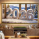 Welcome the New Year in the coziest way possible. This 2026 artwork features soft, white fur numbers resting in a warm alpine lodge setting, framed by golden light and snow-covered mountains beyond the window. The result is a calm, luxurious winter atmosphere that feels both modern and timeless.