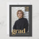 Mark a major milestone with this modern, editorial-style graduation announcement designed with a bold aesthetic. Design features a clean charcoal background with warm gold-toned typography and a refined layout. An easy-to-use template allows you upload your photo and personalize the class year, graduate's name, and school. On the back is a coordinating grad party invitation layout that transitions seamlessly from announcement to celebration. Personalize with the graduate's name and party details. © Kimbellished, LLC