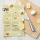 Dieses Design ist spielerisch und fröhlich vor einem hellgelben Hintergrund, der mit niedlichen Bienen aus dem Cartoon in verschiedene Richtungen geschmückt ist. Die Bienen sind illustriert mit klassischen, schwarz-gelben Streifen und weißen Flügeln, die eine skurrile und freundliche Touch verleihen.