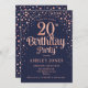 20. Geburtstagsfeier Einladung. Elegantes Design in Marine und Imitate Glitzer Rose Gold. Features stilvolle Skript-Schriftart und Konfetti. Nachricht, wenn du ein Alter brauchst.
