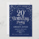 20. Geburtstagsfeier Einladung. Elegantes Design in dunkelmarineblau und Imitate Glitzer Silber. Features stilvolle Skript-Schriftart und Konfetti. Nachricht, wenn du ein Alter brauchst.
