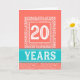 Ein unverwechselbares und attraktives Design in Korallen, Weiß und Türkis. Die Zahl 20 ist in Weiß gehalten und in einem quadratischen, dekorativen Rahmen mit Set versehen. Ein Teil der Grenze besteht aus einem Wirblen Wellenmuster und wird durch eine Kontur ergänzt, die aus dem Wort "GRATULATIONS" besteht, das viermal um das Quadrat geschrieben wurde. Unterhalb ist der Text "YEARS", Set vor einem türkisfarbenen Hintergrund, der sich schön mit der Hauptfarbe der Koralle kontrastiert. Unter dem Wort "JAHRE" befindet sich ein passendes Muster zu dem Muster, das einen Teil des Randes um die Zahl 20 ausmacht. Natalie Kinnear Cards