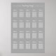 Bis zu 20 Tabellenlayout, nach Tischnummer, nicht nach Namen, mit bis zu 12 Personen pro Tisch. Ein einfacher weißer Text auf grauem (Hintergrund ist anpassbar) Sitzplan; klicken Sie auf "Anpassen", um Spalten zu verschieben, Schriftart, Farben, Hintergrundfarbe oder Postergröße zu ändern. Schwarzer Text auf farbigen Versionen auch verfügbar. Klicken Sie auf und ziehen Sie die Tabellen (beginnend von der Seite), um mehrere Tabellen gleichzeitig zu verschieben.
