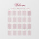 Eine einfache, transparente Sitzkarte mit 20 Tischen, die für eine Bordeaux-Hochzeit empfohlen wird, aber auch für andere Gelegenheiten verwendbar ist. Es handelt sich um eine Fensterverkleidung, die auf ein Fenster oder eine andere durchsichtige Glas- oder Acryloberfläche gelegt werden kann. Der gesamte Text ist bordeauxrot. Das Wort Willkommen ist in einem eleganten kalligrafischen Skript geschrieben, die Erholung in Kappen. Die 20 Tabellen sind auf 4 Zeilen x 5 Spalten verteilt. Es ist portrait orientiert. Über ihnen und unter dem Wort "Willkommen" steht die Meldung "Bitte finden Sie Ihren Sitzplatz!".