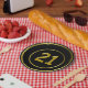 Teller für eine Geburtstagsfeier. Schwarze Teller mit zwei goldenen Ringen, einer an der äußeren Kante und einer naher an der Mitte. In der Mitte der Platte befinden sich die Zahlen 21 in Gelb/Gold.