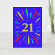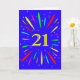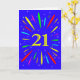 Eine explosive 21. Geburtstagskarte! Was für eine wunderbare Art, Geburtstagsgrüße zu schicken. Die Zahl 21 in hellgelb mit einer Explosion von hellen Farben und Sternen.