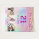 Zum 21. Geburtstag Party. Eine Collage von 3 Fotos von Freunden, Familie, Interesse oder Haustieren. Ein Regenbogen, holografische Hintergrundfarbe in lila, rosa, Rose Gold und Minzgrün. Dekoriert mit Imitaten Glitzer Tropfen. Personalisieren und fügen Sie ihren Namen, Alter 21 und ein Datum. Geburtsdatum oder Geburtsdatum der Geburtstagsparty. Lila Text. Ideal für ein Party mit Überraschung! Nutzen Sie als Begrüßungsbanner, Wanddekoration oder als Foto-Standbanner.