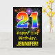 Die Vorderseite dieser aufregenden, lustigen und bunten Geburtstagskarte zeigt eine große Zahl "21" mit einem inspirierten Regenbogenspektrum-Gefälle, zusammen mit der Meldung "Happy 21. Geburtstag" und einem benutzerdefinierten Empfängernamen. Die Vorderseite hat zusätzlich ein farbenfrohes Hintergrundmuster, das durch das Aussehen eines berstenden feierlichen Feuerwerks inspiriert wird. Im Inneren befindet sich eine individuell anpassbare Geburtstags-Grußnachricht, oder vielleicht kann gelöscht und links werden, wenn eine Nachricht von Hand geschrieben werden soll. Eine individuell gestaltbare Geburtstagskarte wie diese könnte eine lustige Art sein, eine Botschaft zum Feiern des 21. Geburtstages von jemandem zu senden. [~Z0000442]
