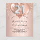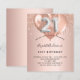Für einen eleganten 21. Geburtstag. Eine Rose Gold Imitate metallisch aussehend Hintergrund. Mit Rose Gold, rosa Tropfen, Tropffarbe und Ballons dekoriert. Personalisieren und fügen Sie einen Namen und Party-Details. Der Name ist mit einem handgeschriebenen Stil Skript geschrieben, Nummer 21 mit silbernen ballon Stil Schriftart.