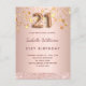 Ein modernes, stilvolles und glamouröses Party zum 21. Geburtstag. Ein Imitat Rose gold metallische Hintergrund mit Imitaten goldenen tropfenden Sternen. Der Name ist mit einer modernen dunklen Rose goldfarbenen handgeschriebenen Schreibschrift geschrieben. Personalisieren Sie Ihre Party-Daten und fügen Sie sie hinzu. Nummer 21 wird mit einem Schriftart im Ballonstil geschrieben, Skript. Zurück: Rose goldener Hintergrund, Postkartendesign. Tipp: Wenn Sie es nicht so gewollt haben, dass es wie eine Postkarte aussieht, klicken Sie auf Anpassen, gehen Sie auf die Rückseite und entfernen Sie den Trenner und posten Sie die Briefmarke.