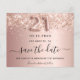 Eine trendige und mädchenhafte Save the Date-Karte für ein Party zum 21. Geburtstag. Rose goldener Hintergrund mit Rose Imitate Glitzer Staub verziert. Personalisieren und fügen Sie Datum und Namen/Text hinzu. Der Text: Save the Date wird mit einem großen angesagten, handgeschriebenen Stilskript mit Swashes geschrieben. Nummer 21 mit einem Schriftart im Ballonstil.