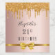 Elegantes, klassisches, glamouröses und mädchenhaftes Geburtstagslabel. Imitate goldfarbene Schleife und Bogen mit Imitaten goldenen Glitzer tropfen. Hintergrund. Mit dem Text: 21. Geburtstag. Vorlage für einen Namen, der mit einem modernen handgeschriebenen Stilskript geschrieben wurde.