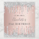 Für ein mädchenhaft und glamourös 21. Geburtstag Party. Eine Rose Gold Imitate metallisch aussehen Hintergrund mit Rose Gold, Rosa und Imitate silverglitter Tropfen, Farbe Tropfen Aussehen. Personalisieren und fügen Sie ein Datum, Name und Alter 21. Der Name ist in dunkelgrau geschrieben mit einem modernen handgeschriebenen Stil.