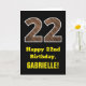 Diese rustikale, lustige Geburtstagskarte-Design hat eine große Zahl "22" mit einem Imitat Holz Korn inspirierte Aussehen Muster auf der Vorderseite. Auf der Vorderseite steht auch die Geburtstagsgrüßbotschaft "Happy 22. Geburtstag" und ein personalisierter Empfängername. Im Inneren befindet sich eine individuell anpassbare Geburtstags-Grußnachricht, oder vielleicht kann gelöscht und links werden, wenn eine Nachricht von Hand geschrieben werden soll. Eine individuell gestaltbare Geburtstagskarte wie diese könnte eine lustige Art sein, eine Botschaft zum Feiern des 22. Geburtstages von jemandem zu senden. [~Z0000433]