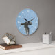 Ein Foto eines Möwen, der am Himmel fliegt. Die Uhr hat eine weiße Zahl.
