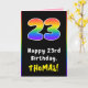 Dieses fröhliche und kühn gestaltete Geburtstagskarten-Design zeigt eine große Zahl "23" mit einem lebendigen Regenbogenspektrum inspirierten Farbverlaufsmuster, zusammen mit der Meldung "Happy 23. Geburtstag" und einem personalisierten Empfängernamen. Im Inneren befindet sich eine individuell angepasste Geburtstagsgrüßbotschaft, oder man könnte sie löschen und leer verlassen werden, wenn eine Nachricht von Hand geschrieben werden soll. Eine fröhliche, bearbeitbare Geburtstagskarte wie diese kann zum Feiern des dreiundzwanzigsten Geburtstages von jemandem geschickt werden. [~Z0000627]