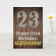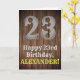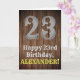 Dieses Landaussehen und American Old West sehen Geburtstag Thema Grußkarte Design mit einem großen rustikalen Look Nummer "23", die Nachricht "Happy 23. Geburtstag", ein bearbeitbarer Name, und ein Imitat/Imitation Holz Getreide inspirierte Look Muster Hintergrund. Die Innenseite hat eine bearbeitbare Geburtstagsgrüßnachricht, oder könnte gelöscht und leer verlassen werden, wenn eine Nachricht stattdessen von Hand geschrieben werden soll. Eine individuell anpassbare Geburtstagskarte wie diese könnte eine lustige Art sein, jemandem, der seinen dreiundzwanzigsten Geburtstag feiert, eine Geburtstagsgrüße zu senden. [~Z0000469]