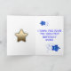 Ein großer glänzender goldener Stern, in den man den Namen des Geburtstagsjungen setzen kann. Der Hintergrund ist blau mit hübschen weißen Wirbel.