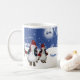Niedliche Schneemänner fahren unter einem Weihnachtsmond.